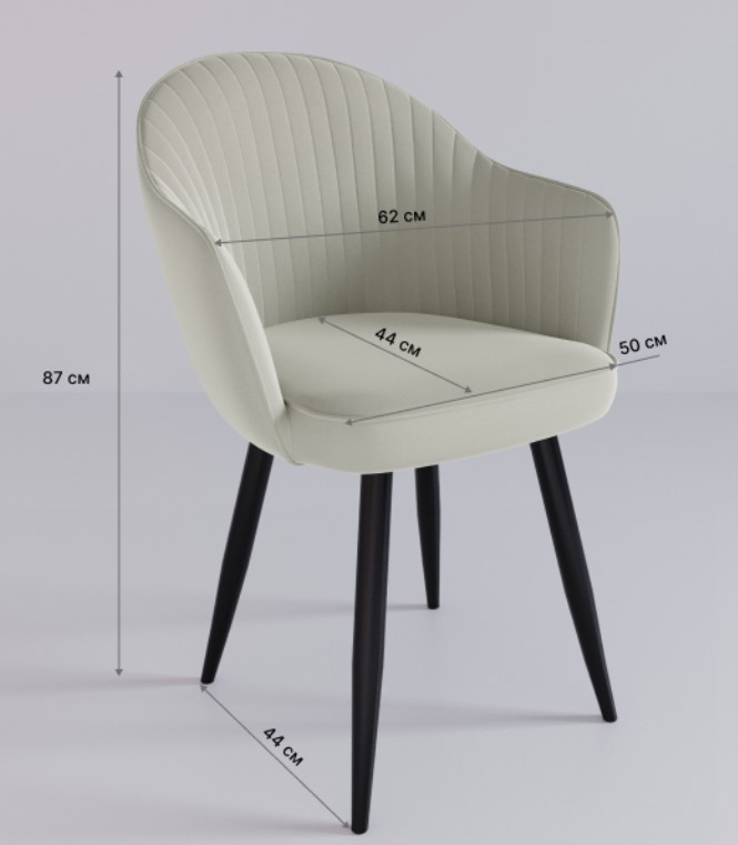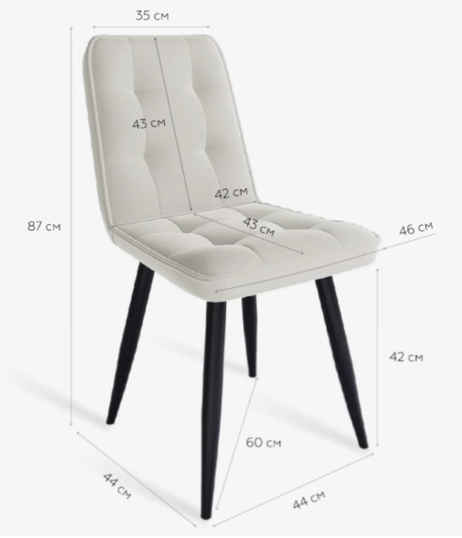 Габариты Ширина стула 62 см Ширина сиденья 55 см Глубина стула 44 см Глубина сиденья 44 см Высота от пола до сиденья 44 см Высота стула с учётом спинки 87 см