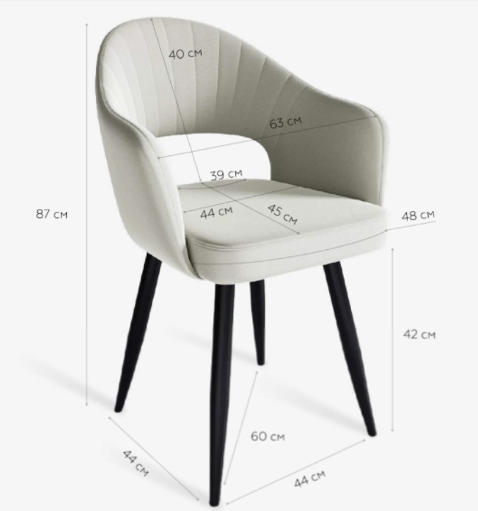Габариты Ширина стула 63 см Ширина сиденья 48 см Глубина стула 44 см Глубина сиденья 45 см Высота от пола до сиденья 44 см Высота стула с учётом спинки 87 см