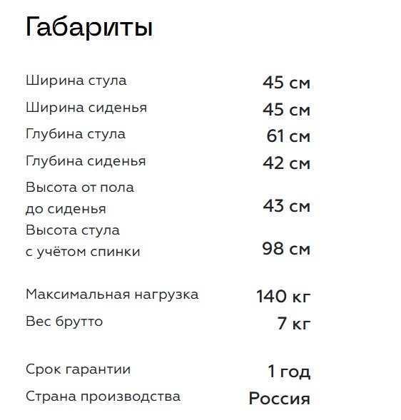 Ширина стула 48 см Ширина сиденья 47 см Глубина стула 57 см Глубина сиденья 43 см Высота от пола до сиденья 43 см Высота стула с учётом спинки 87 см Максимальная нагрузка140 кг Вес брутто7 кг Срок гарантии1 год Страна производства Россия