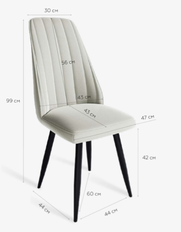 Габариты Ширина стула 61 см Ширина сиденья 47 см Глубина стула 44 см Глубина сиденья 43 см Высота от пола до сиденья 42 см Высота стула с учётом спинки 94 см