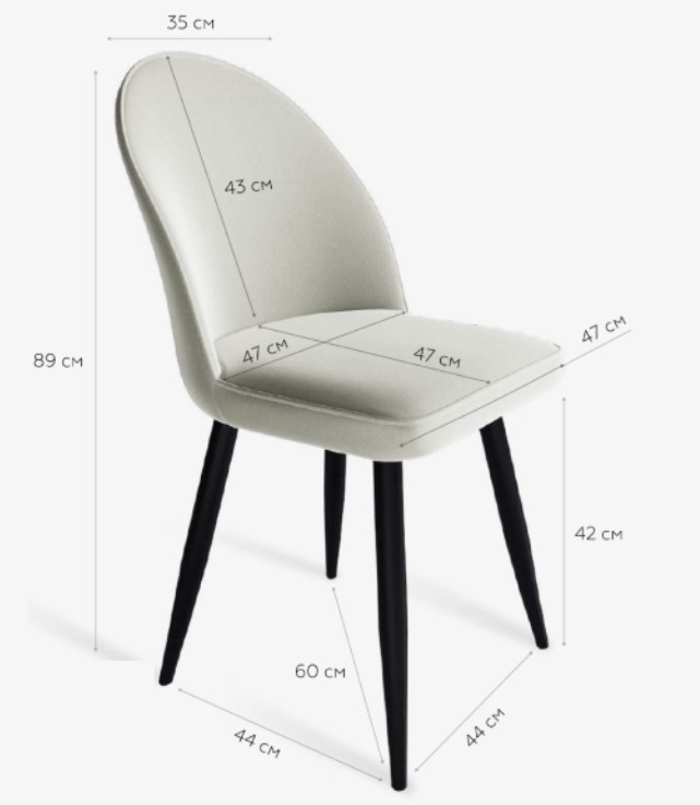 Габариты Ширина стула 47 см Ширина сиденья 47 см Глубина стула 44 см Глубина сиденья 47 см Высота от пола до сиденья 42 см Высота стула с учётом спинки 89 см