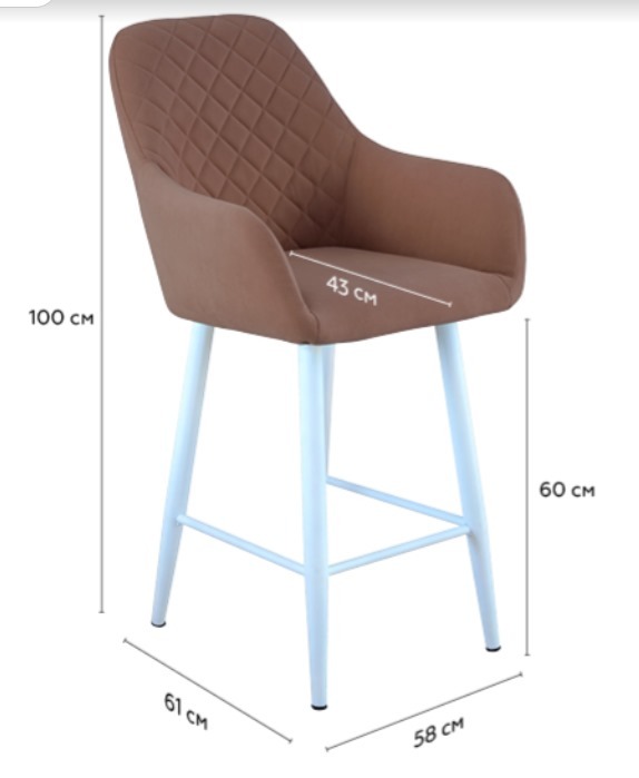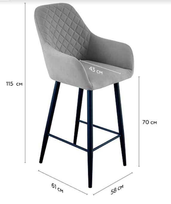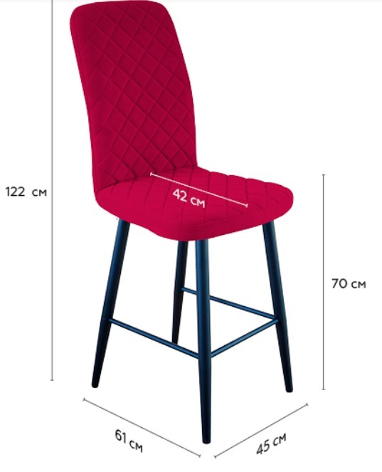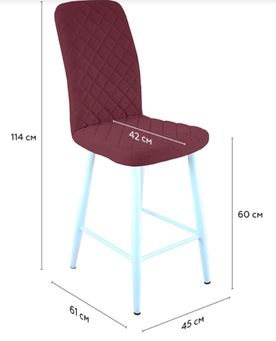Габариты Ширина стула 45 см Ширина сиденья 45 см Глубина стула 61 см Глубина сиденья 42 см Высота от пола до сиденья 43 см Высота стула с учётом спинки 98 см